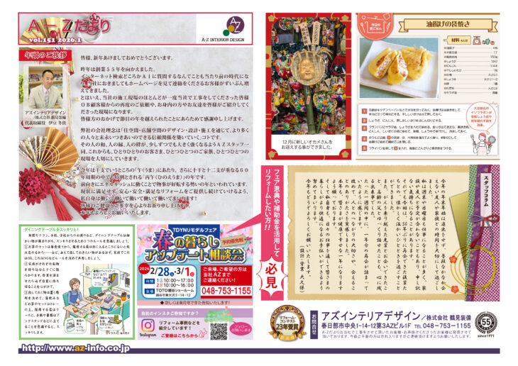 資料請求 HOMEA-ZだよりA-ZだよりA-Zだよりvol.151 2026.1 A-Zだよりvol.151 2026.1 A-Zだより一覧はこちら A-Zだより一覧はこちら COMPANY 会社案内代表挨拶会社概要企業理念アクセスマップ 私達の考える住まい創り スタッフ紹介 WORKS 施工事例一覧 戸建て 全面 LDK 水まわり 外まわり マンション 新築 店舗 医療・介護施設 受賞実績 VOICE お客様の声一覧 CONTENTS 施工の流れ A-Zだより 一覧 スタッフ募集 スタッフブログ 住宅省エネ2026キャンペーン 先進的窓リノベ2026事業 給湯省エネ2026事業 みらいエコ住宅2026事業 CONTACT お問い合わせ 資料請求