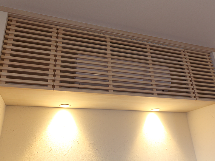 エアコンは格子状のインテリアで収納。 間接照明も取り入れました。