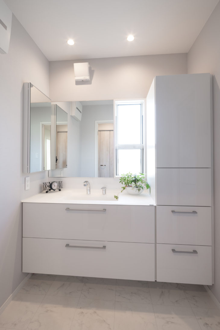 明るく清潔感のある洗面・脱衣室。洗面化粧台はTOTOの「エスクア」。
