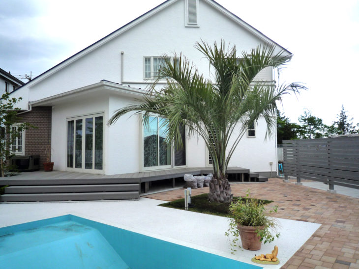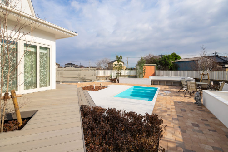 | お客様のご要望 | ①暑さが苦手な大型犬と暮らしているが、ドッグランのプールで気持ちよさそうに遊ぶ姿を見て、わが家の庭にも可能なら愛犬専用プールを作りたい。 ②室内と庭の出入りをもっと楽にしたい。 ③広い庭は手入れが大変。メンテナンスを楽にしたい。家庭菜園にも愛犬が入り散らかすので何とかしたい。 |