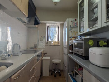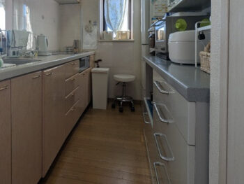 年数が経ち、扉やシンクなど劣化が目立つキッチン 昔ながらの開き扉で奥の物を取り出すことが大変 キッチン内部も昔ながらの木製なので表面材の剥がれが目立つ