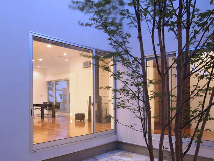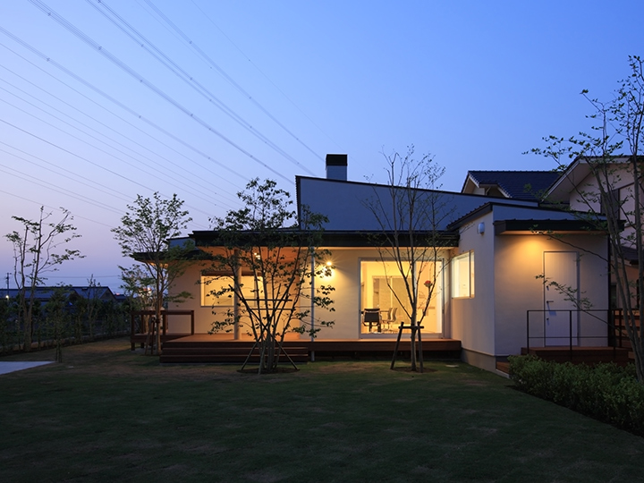 | ご提案内容 | 自然を巧みに取り込む、上質を極めた平屋建ての住まい。 奥行のある敷地を最大限に利用した配置と、中庭を設けることで、どこにいても季節の移ろいが感じられるような空間を目指しました。各々の空間のプライバシーを十分に考えながらも採光・風通しを重視しています。テーマは『リラグゼーション』。 太陽光発電パネルを備えたオール電化住宅でもあります。 |