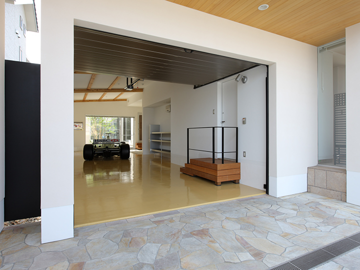 ガレージ奥手に中庭からの光が差し込む